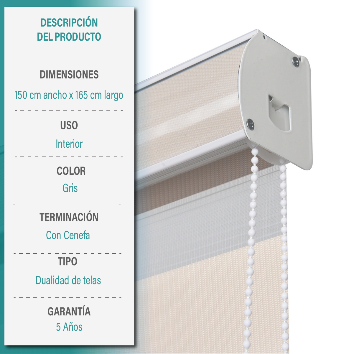 La cortina roller duo puedes encontrarla en 5 colores: Blanco, Beige, Textura Lino, Gris y Capuccino.