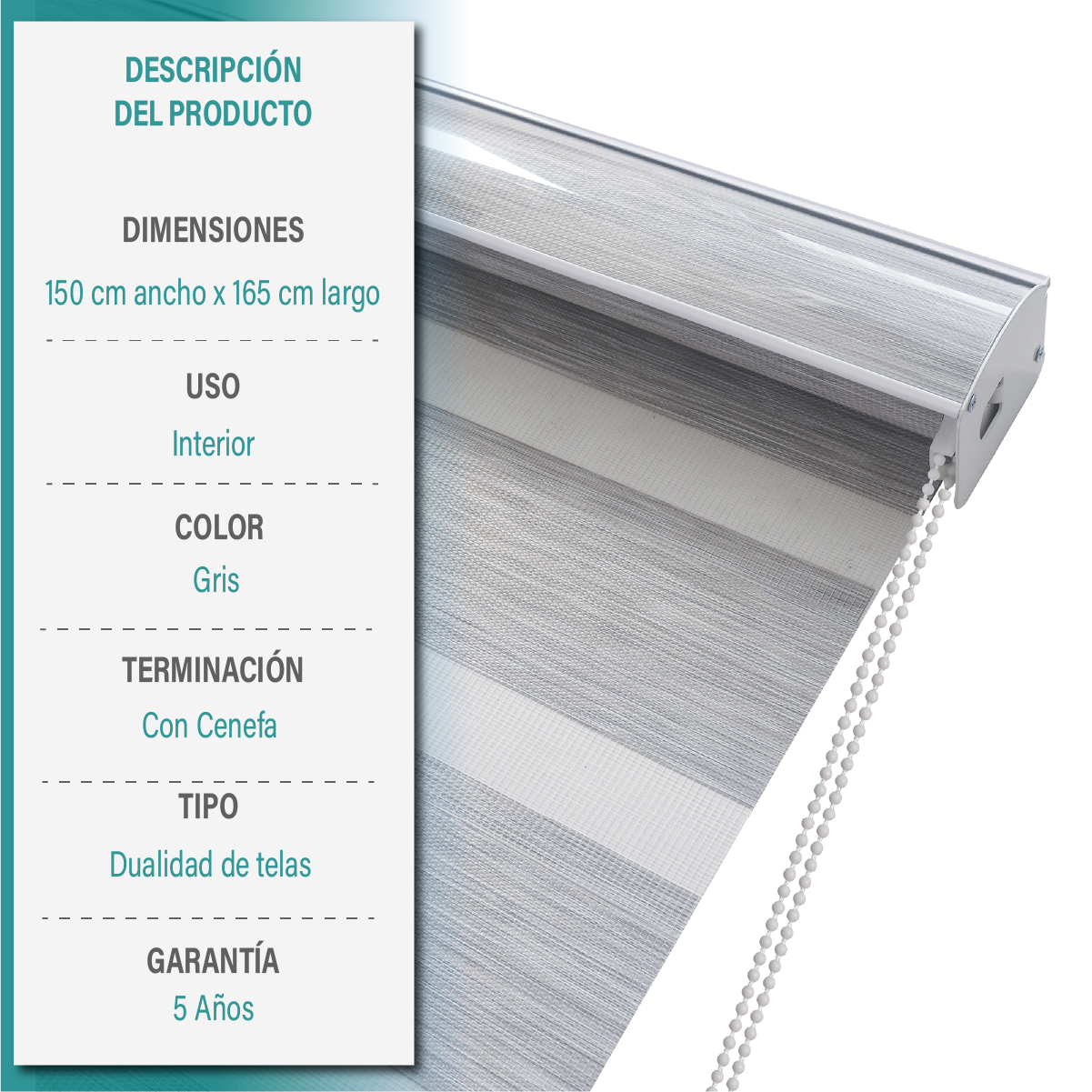 La cortina roller duo puedes encontrarla en 5 colores: Blanco, Beige, Textura Lino, Gris y Capuccino.