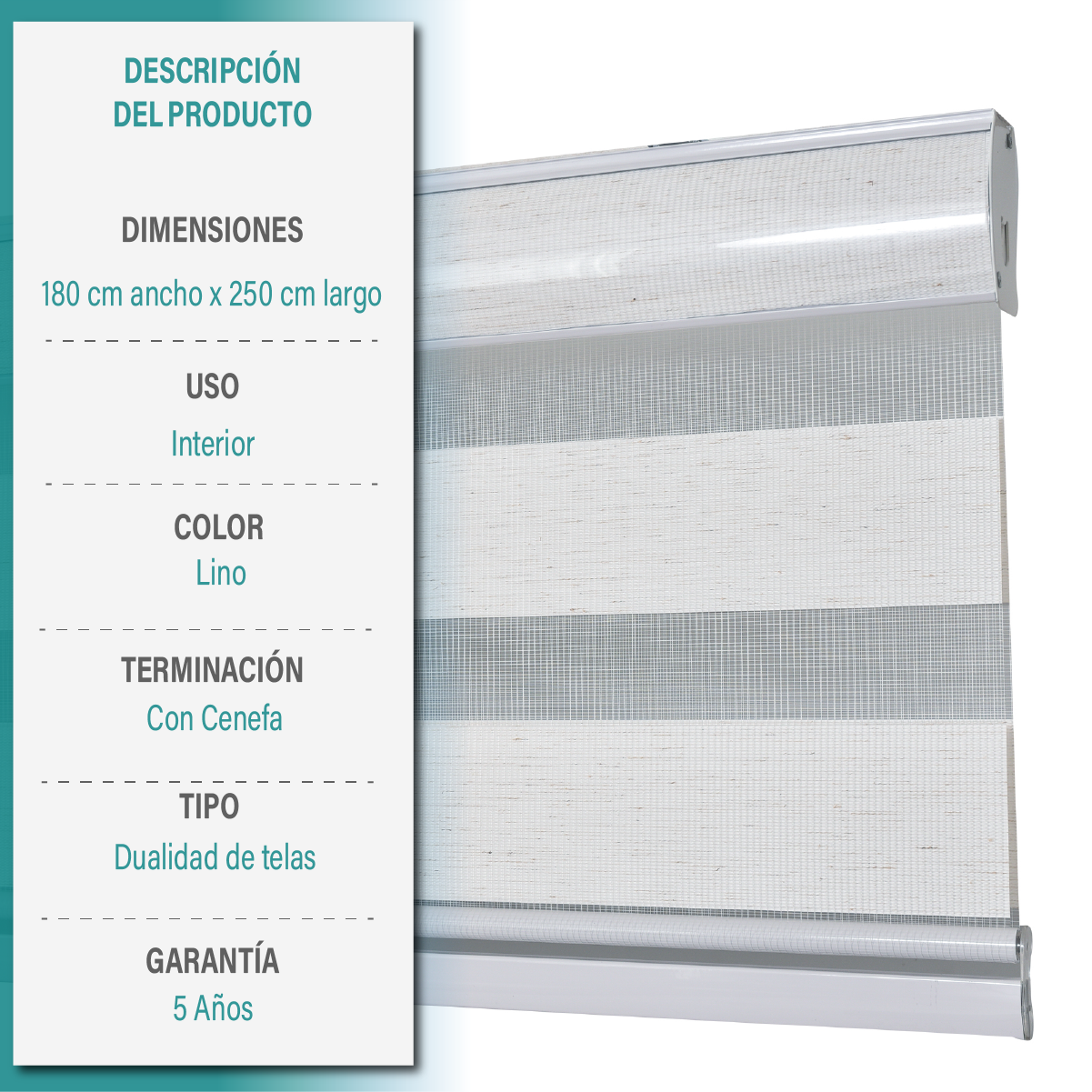 La cortina roller duo puedes encontrarla en 5 colores: Blanco, Beige, Textura Lino, Gris y Capuccino.
