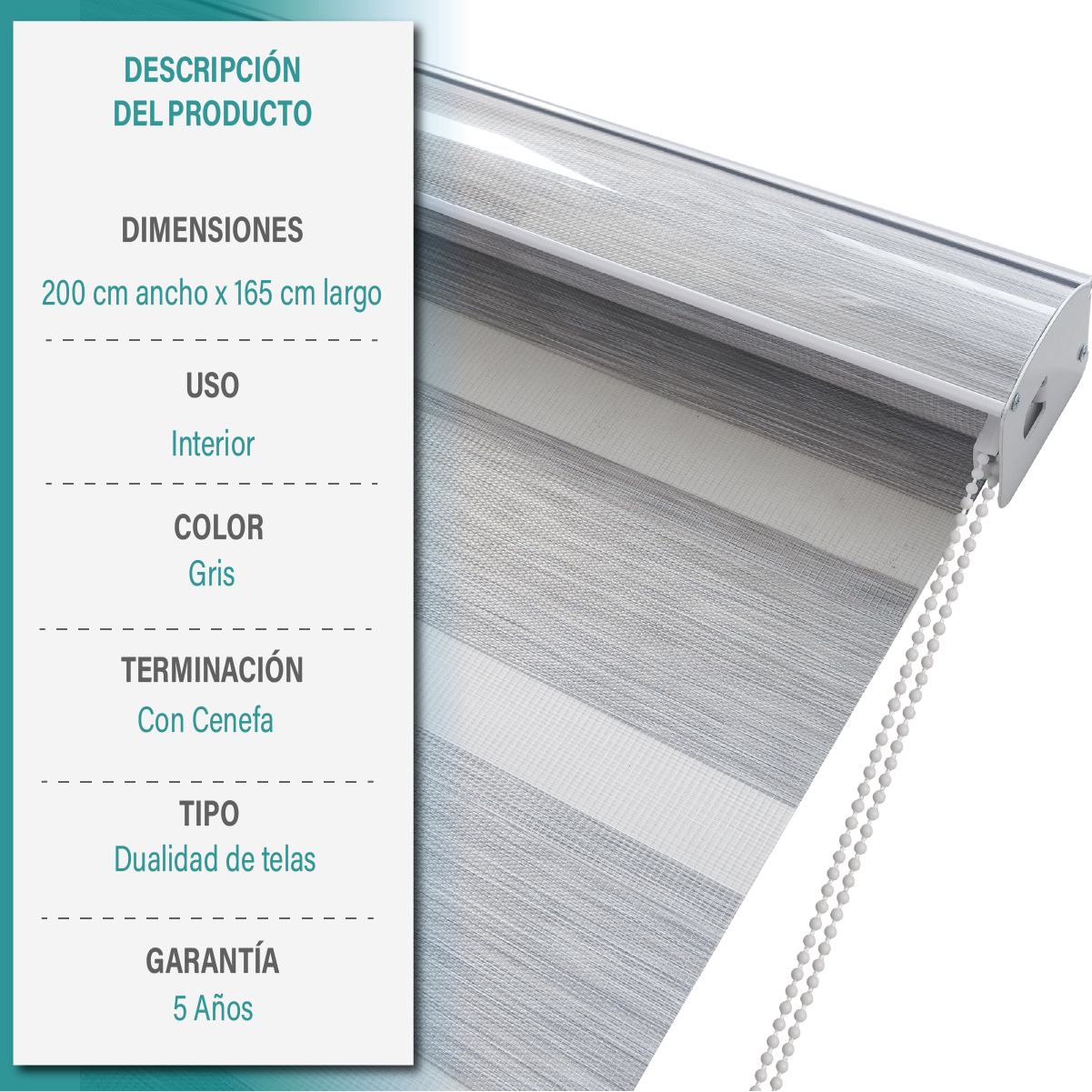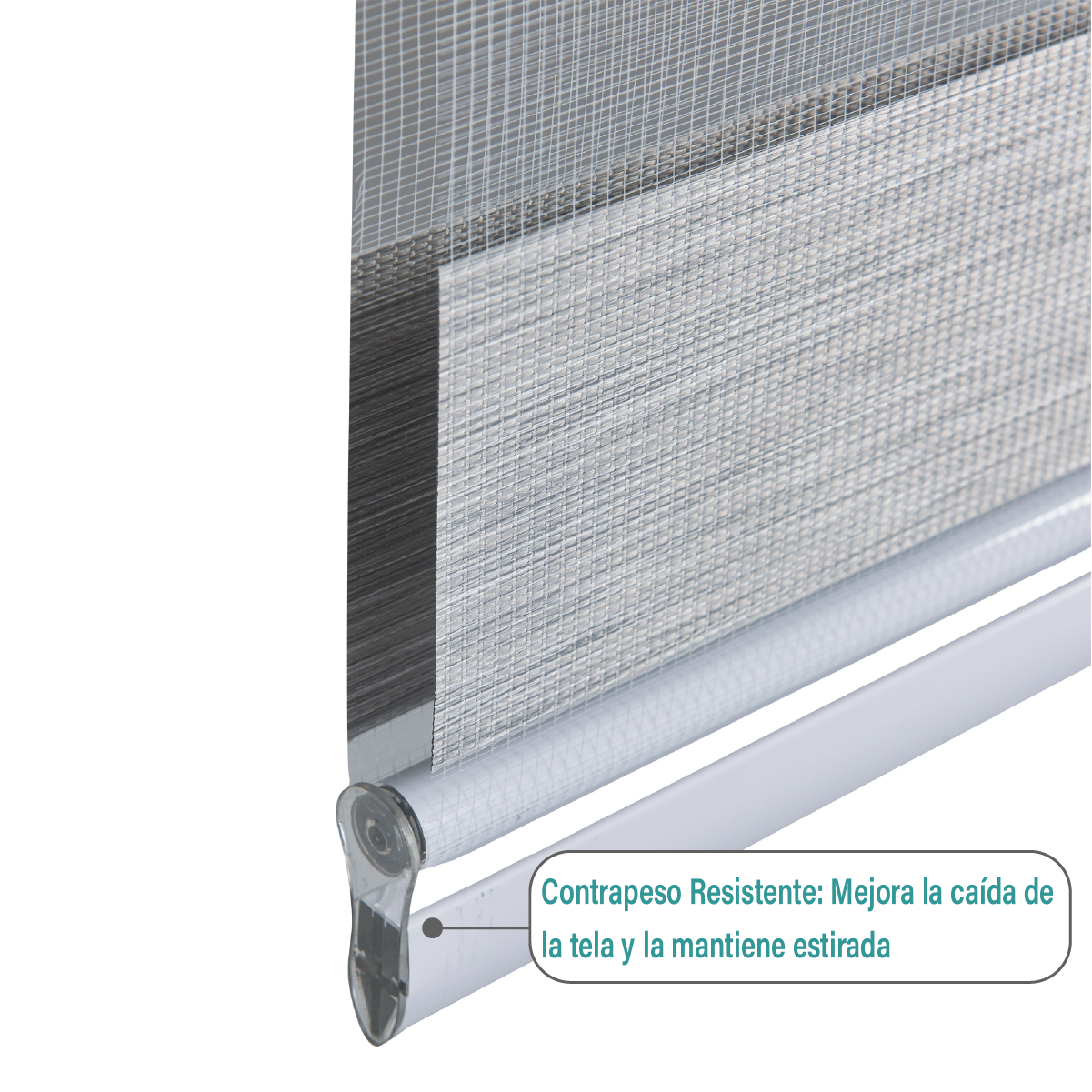 Tiene un control de luz ajustable, gracias a la combinación de tela transparente y tela opaca permite posicionar la cortina en tres niveles: