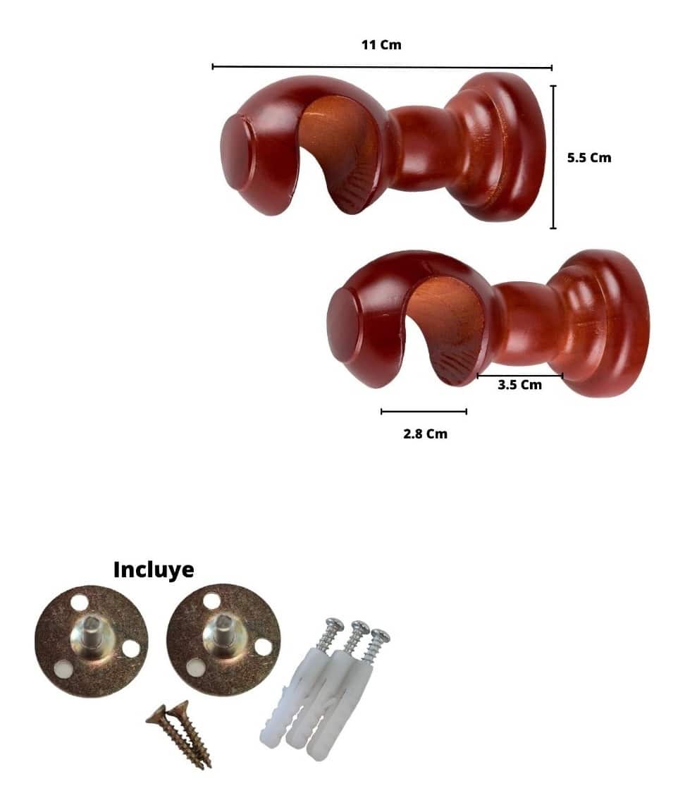 Pack 2 Unidades Soporte Simple De Madera Chocolate 28 Mm + Barra De Madera Color Chocolate De 28 Mm X 2.00 Mt + Pack 10 Anillas De Madera Color Chocolate 28 Mm + Pack 2 Unidades Terminal Bola De Madera Chocolate 28 Mm