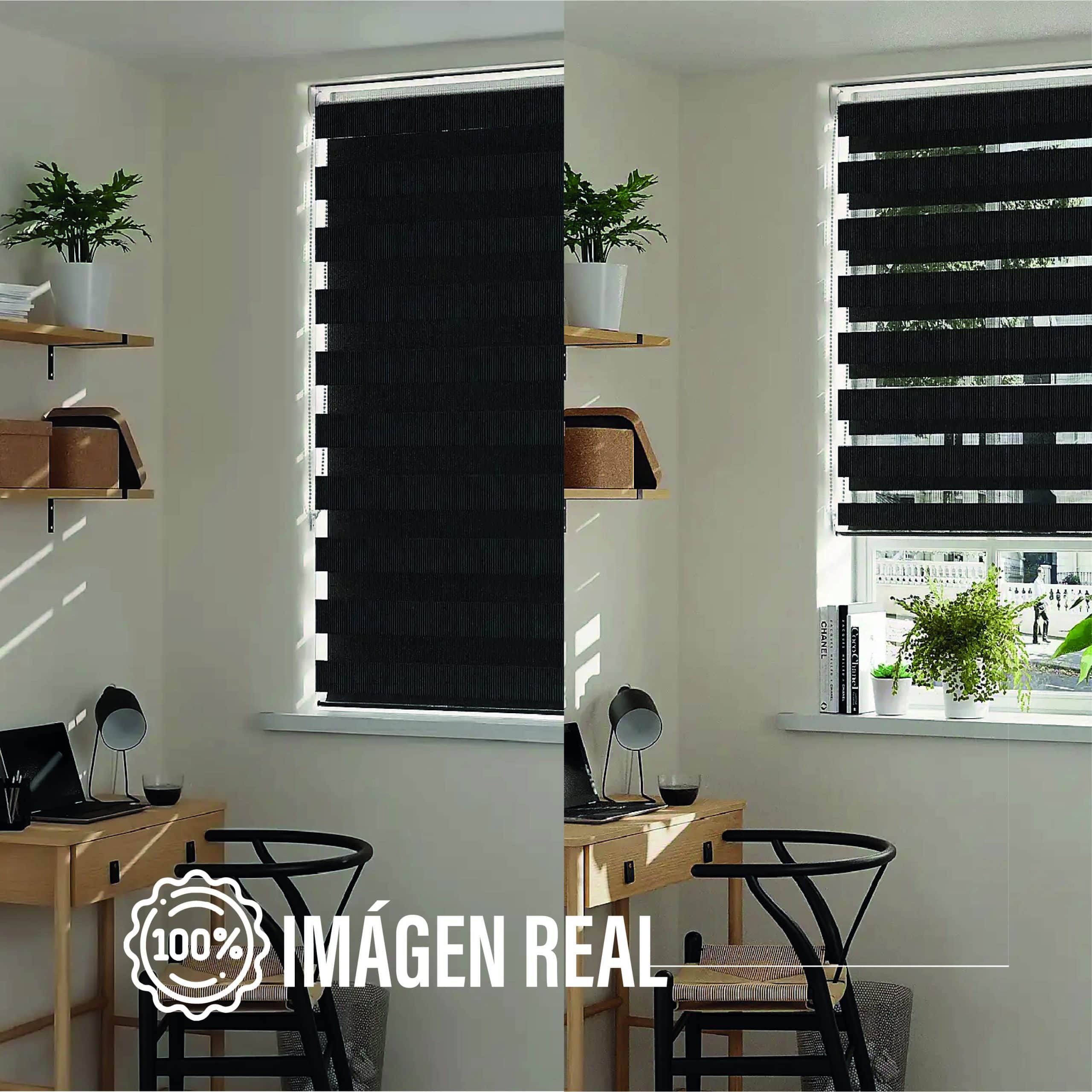 La Cortina Roller Duo Zebra Día y Noche es un producto de alta calidad y diseño moderno. Esta cortina combina dos capas de tela, una con franjas transparentes y otra con franjas opacas, lo que permite regular la entrada de luz y la privacidad de manera fácil y precisa.