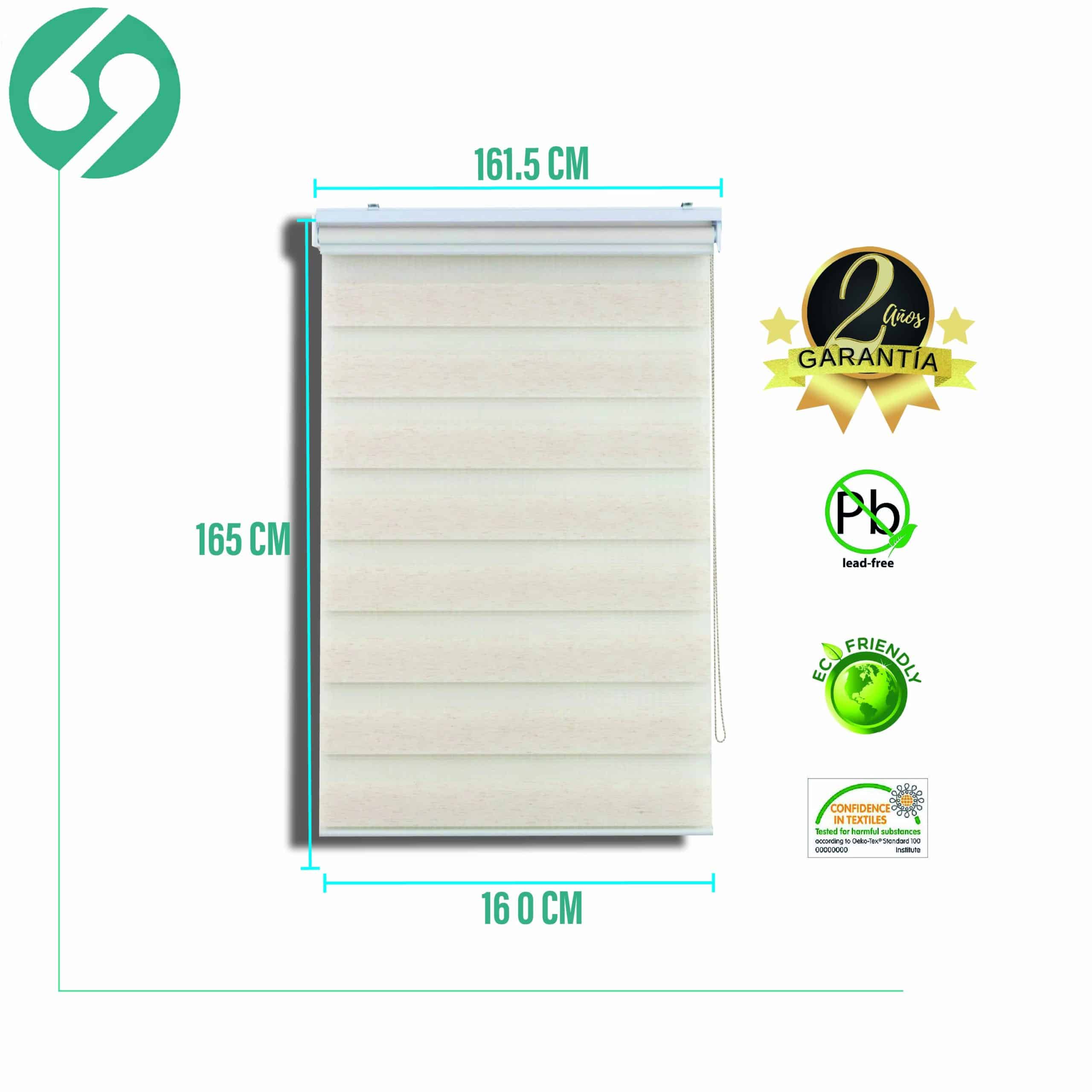 La cortina tiene una medida estándar de 160 cm de ancho por 165 cm de alto, lo cual la hace adecuada para ventanas de tamaño promedio.