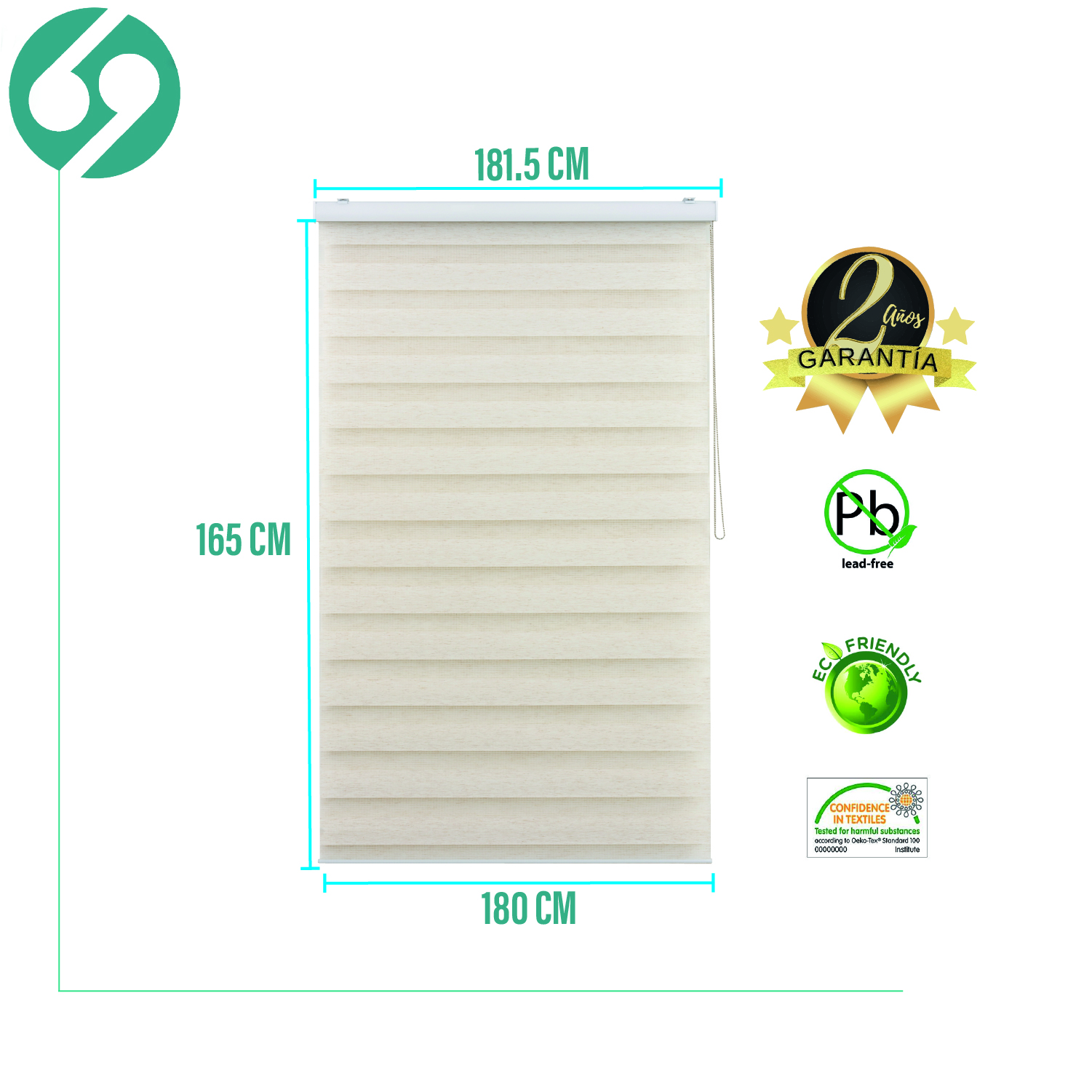 La cortina tiene una medida estándar de 180 cm de ancho por 165 cm de alto, lo cual la hace adecuada para ventanas de tamaño promedio.