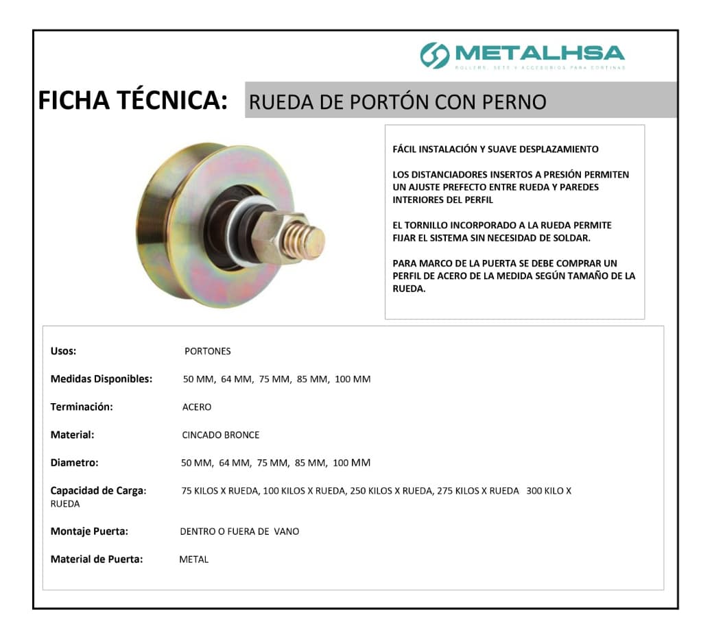 La Rueda de Portón con Perno es la solución ideal para un desplazamiento suave, resistente y seguro en portones corredizos. Su diseño facilita la instalación sin necesidad de soldadura, gracias a su tornillo incorporado que permite fijarla de manera firme y estable. Si prefieres un montaje sencillo y sin soldadura, la rueda con tornillo es la indicada.