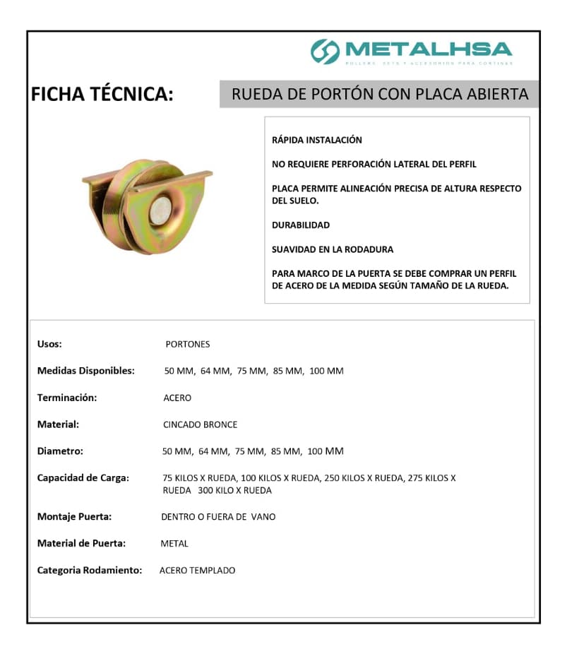 Nuestra Rueda de Portón con Placa Abierta es la solución perfecta para un deslizamiento suave y seguro de tu portón. Su diseño con placa abierta permite una instalación rápida y sencilla, sin necesidad de perforaciones laterales en el perfil, lo que facilita una alineación precisa de la altura respecto al suelo. Si buscas una instalación rápida y sin perforaciones laterales, la rueda con placa abierta es la mejor opción.