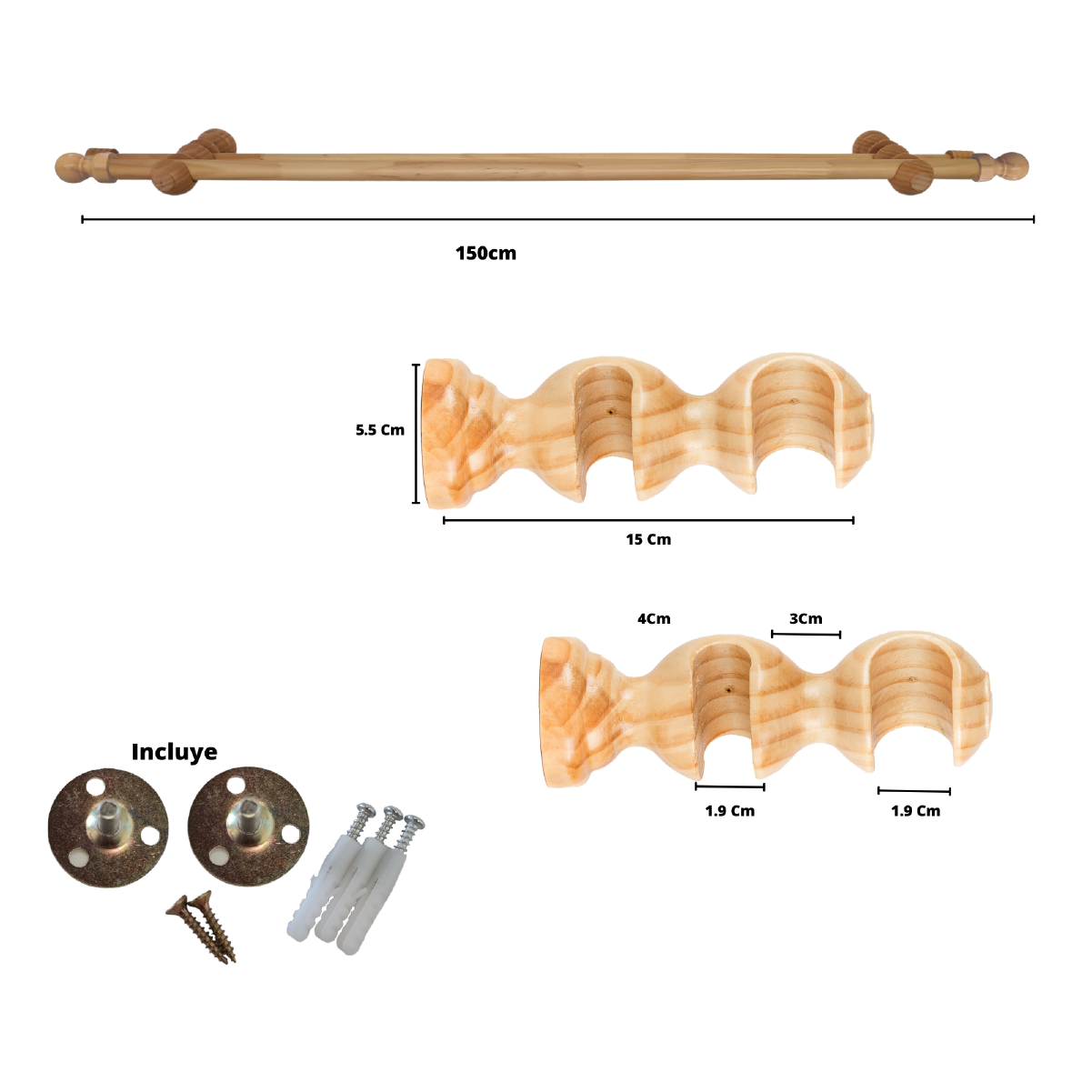 ● 2 Soportes dobles de madera con 19/28 milímetros de diámetro.
