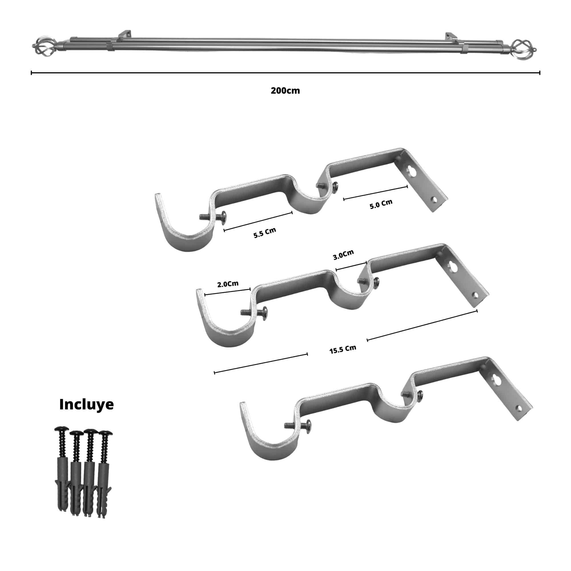 Set Barras para Cortina Doble 19/28 Mm Metal Color Satín x 2.00 Mt Terminal Bola Alambre