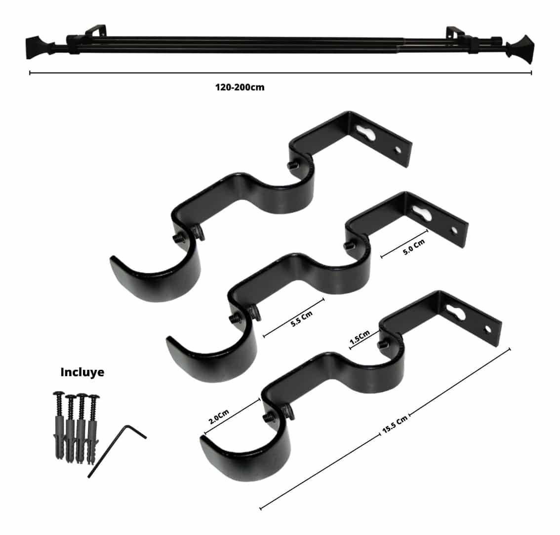 Set Barras para Cortina Doble 13/16 Mm Extensible 120-200 Cm Negro Prisma