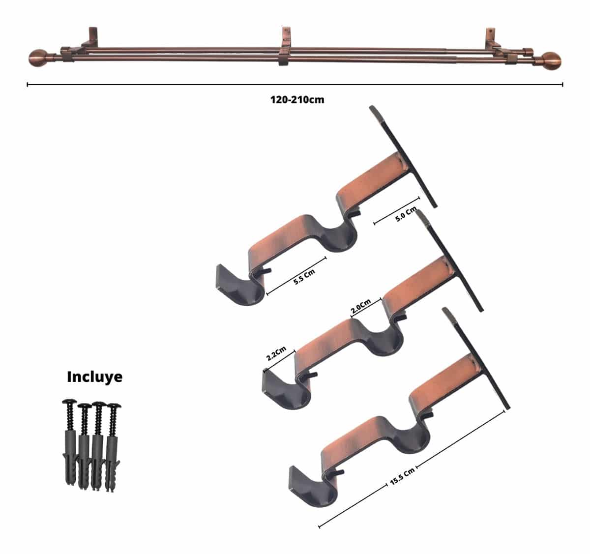 Set Barras para Cortina Doble 16/19 Mm Extensible 120-210 Cm A Muro Cobre Bola