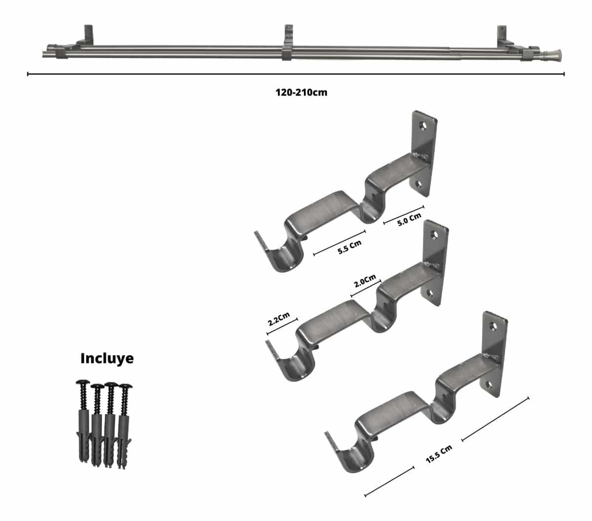 Set Barras para Cortina Doble 16/19 Mm Extensible 120-210 Cm A Muro Satín Cónico