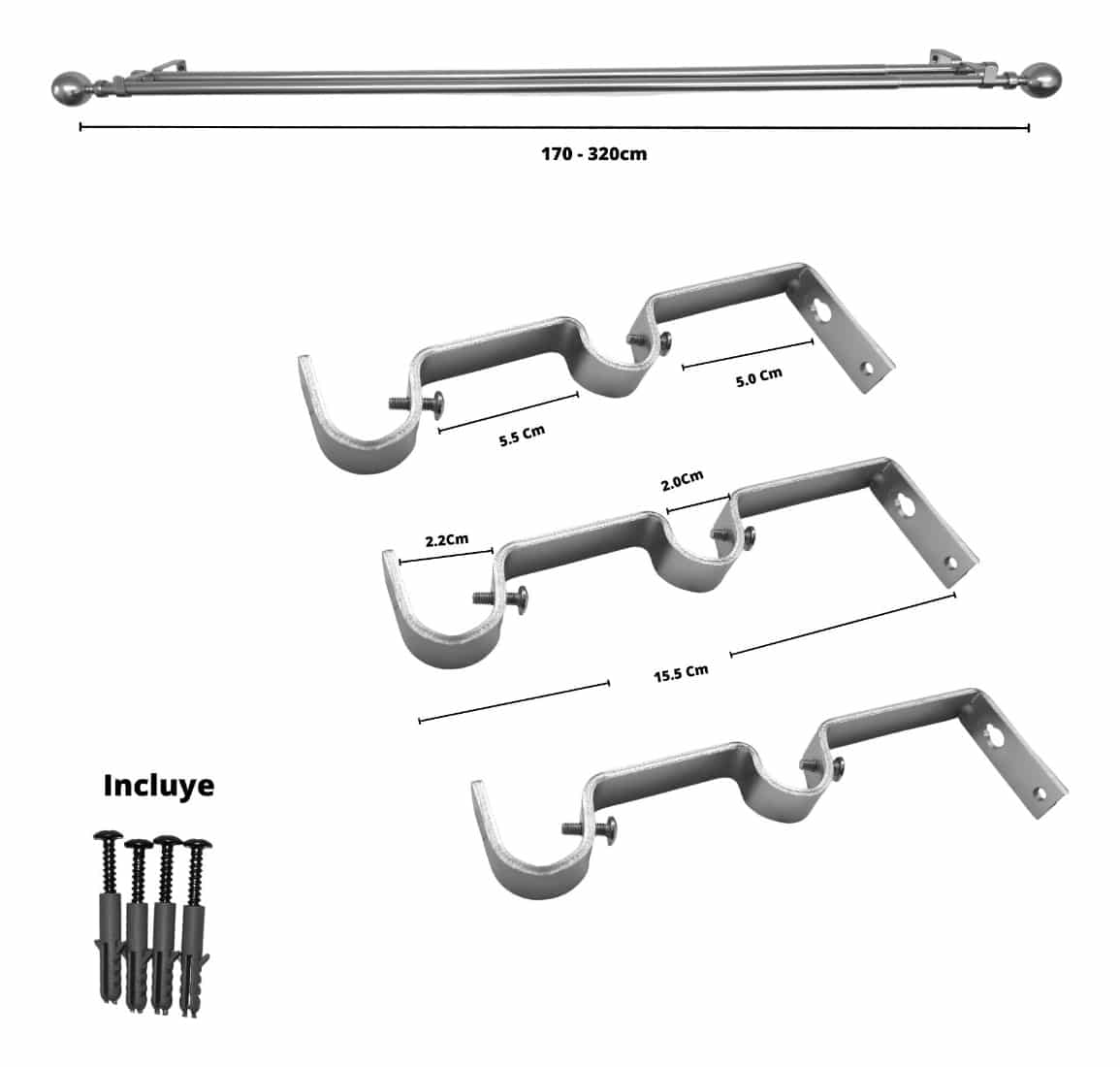 Set Barras para Cortina Doble 16/19 Mm Extensible 170-320 Cm A Muro Satín Bola