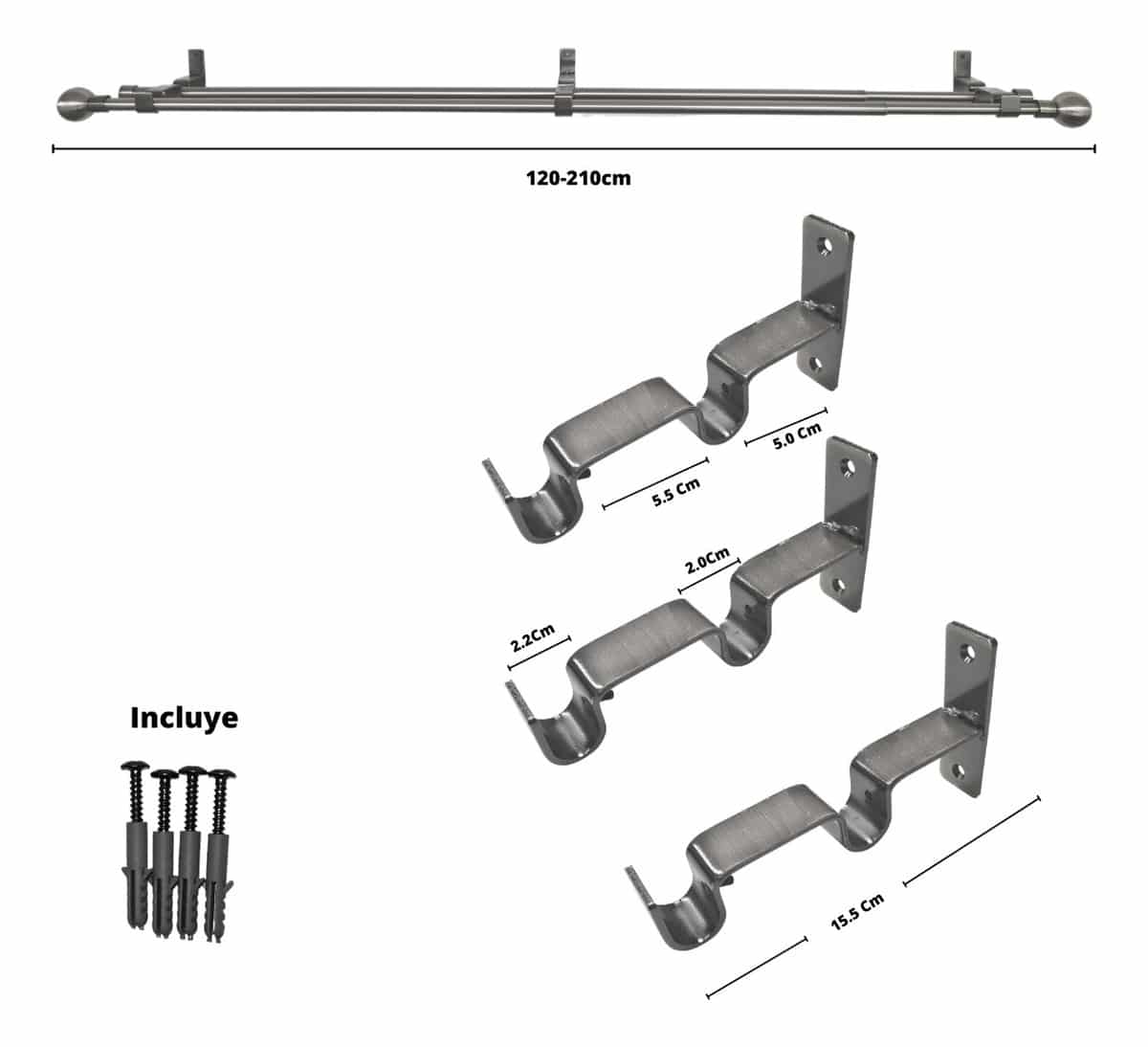 ¿Buscas una forma funcional y con estilo para instalar tus cortinas? El Set Doble de Barras Extensibles de Metal 16/19 mm con soporte de muro es la elección perfecta. Diseñado especialmente para adaptarse a ventanas de diferentes tamaños, este set te permite ajustar la longitud de las barras según las dimensiones exactas de tu espacio, sin necesidad de cortes ni herramientas adicionales.