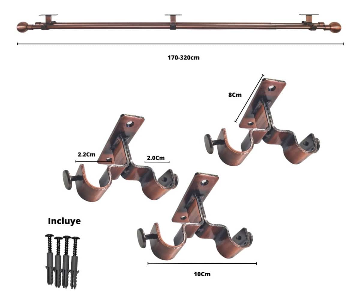 Set Barras para Cortina Doble 16/19 Mm Extensible 170-320 Cm A Techo Cobre Bola